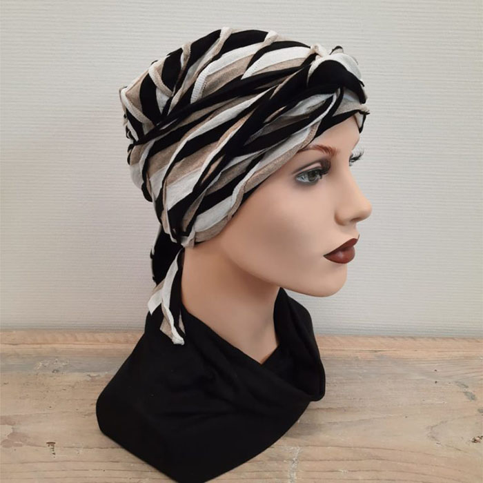 Prachtig mutsje met losse band in dezelfde kleurcombinatie. Binnenkant band is zwart.
